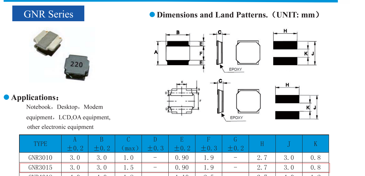 GNR3015NT1R0貼片電感電氣參數: